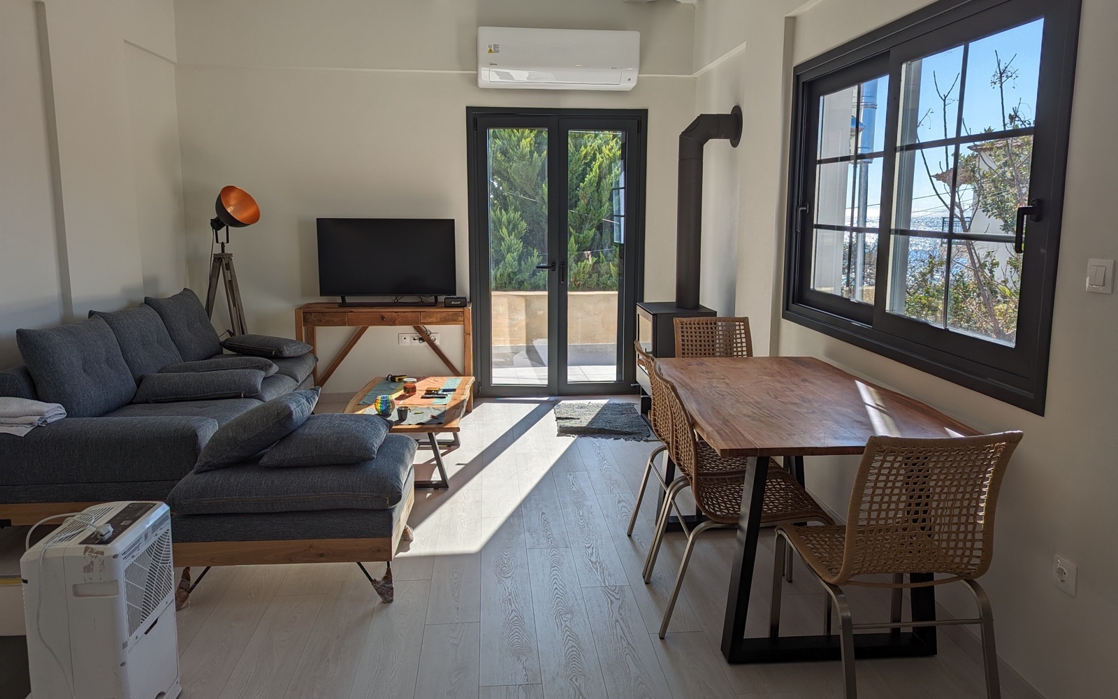 The house has two floors. Downstairs you can find 2 double bedrooms and a bathroom. Upstairs you will find the spacious living room, with an amazing view, a fully equipped kitchen and a smaller bathroom.